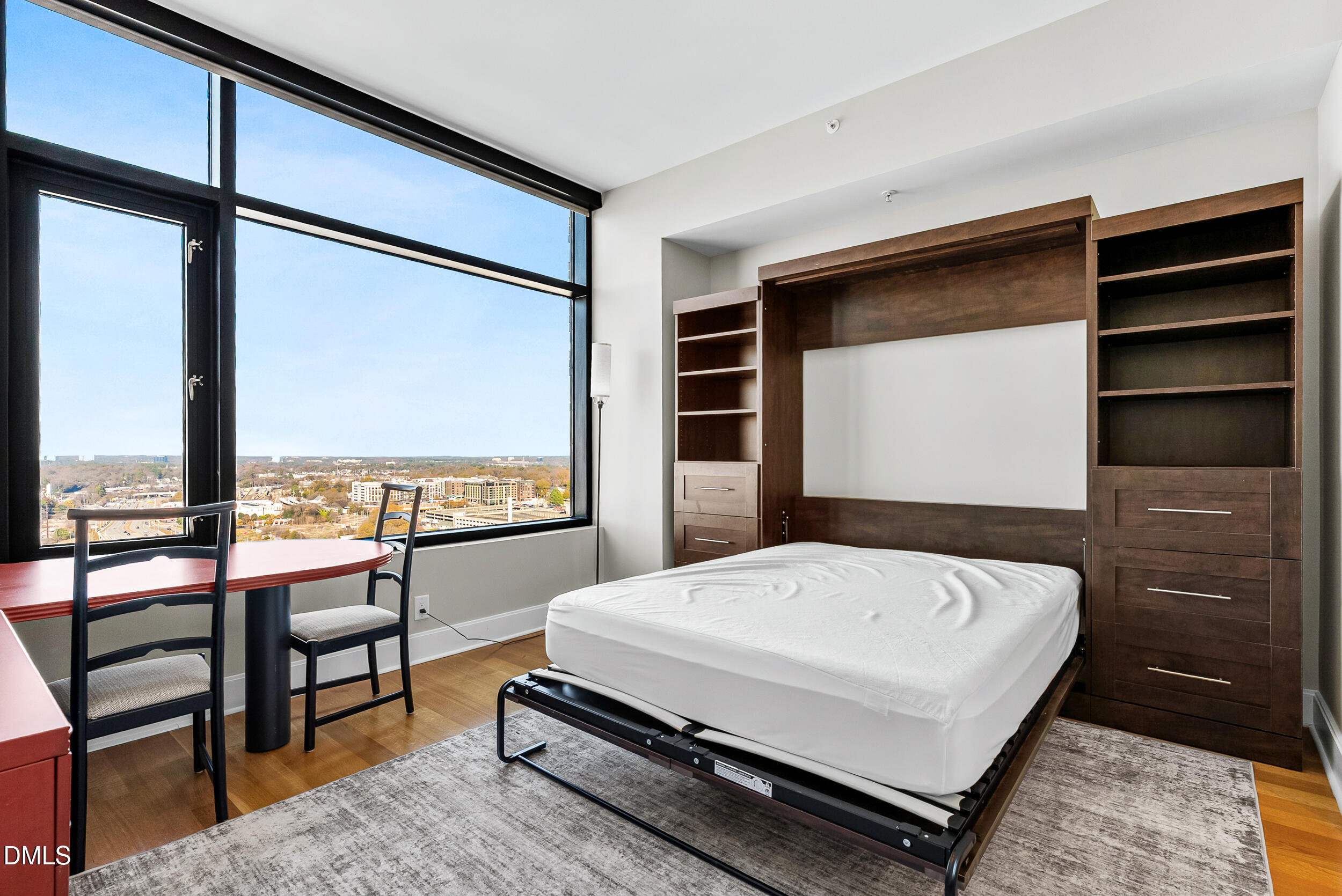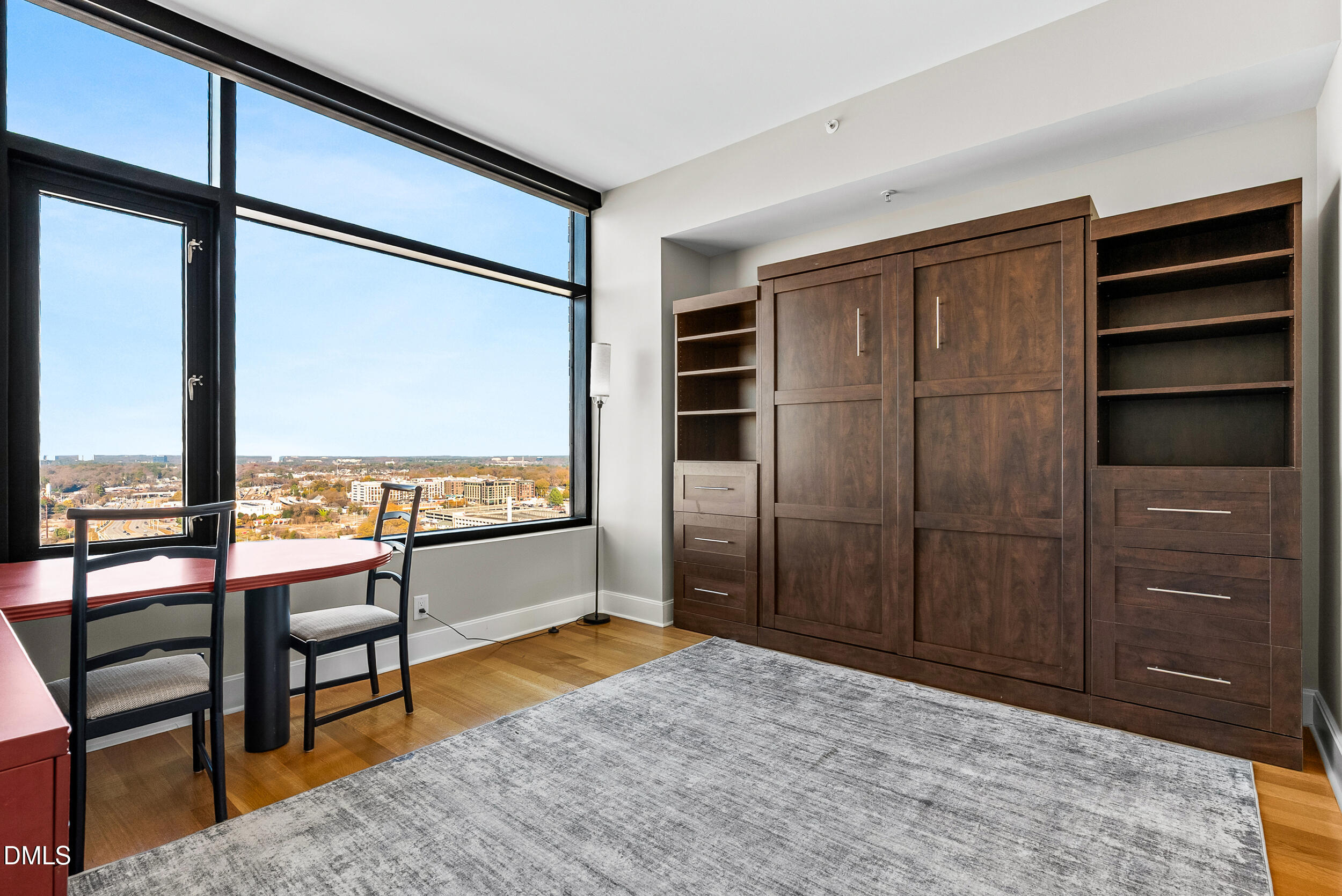 This stylish 2-bedroom corner unit at the desirable Quorum Center Condos showcases sweeping city views from the 14th floor, large windows throughout, and an open layout enhanced by beautiful hardwood floors. murphy bed will convey